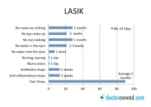 Wear transparent plastic eye-shields while sleeping for the first week, avoid eye rubbing for one month, minimize direct water contact like splashing your eyes while washing your face or showering as much as possible for one week, and avoid swimming for 3 weeks. Additionally, no eye make-up should be applied till after 3 weeks. Visual improvement after LASIK is fast, and patients can see very well by the next day, as they can drive and go back to work. Additional visual improvement occurs within a week or two.